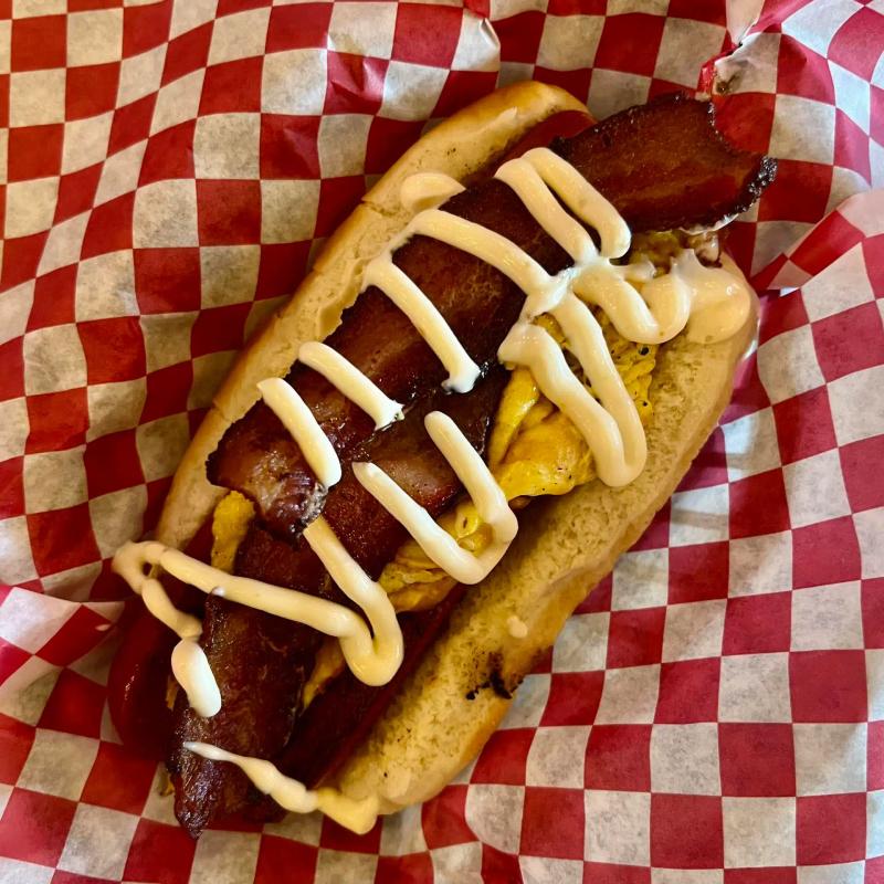 All beef dog with cheesy scrambled eggs, thick cut bacon, and farmer nates hot sauce smokehouse habanero aioli.