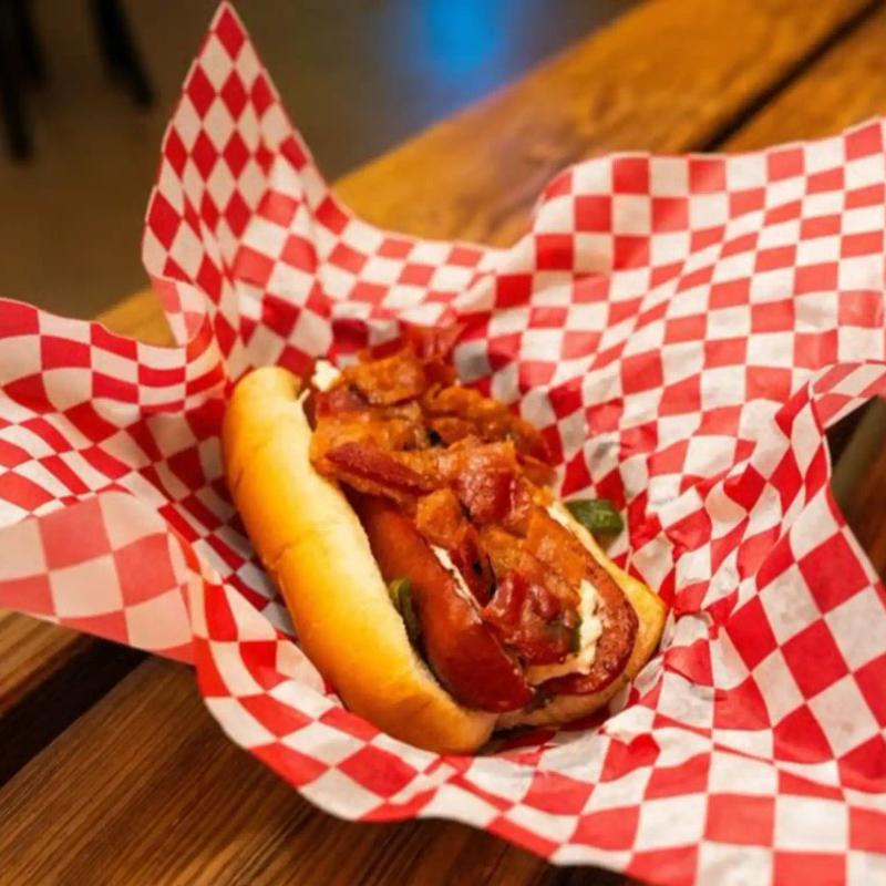 All beef dog with griddled jalapeños, cream cheese, and thick cut bacon bits.