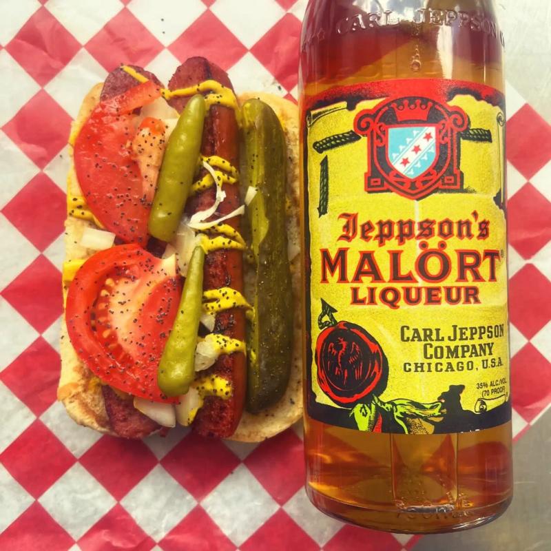All beef hot dog with mustard, neon relish, onions, malort infused sport peppers, celery salt, a pickle spear, and tomato slices. A chicago dog here in ohio.